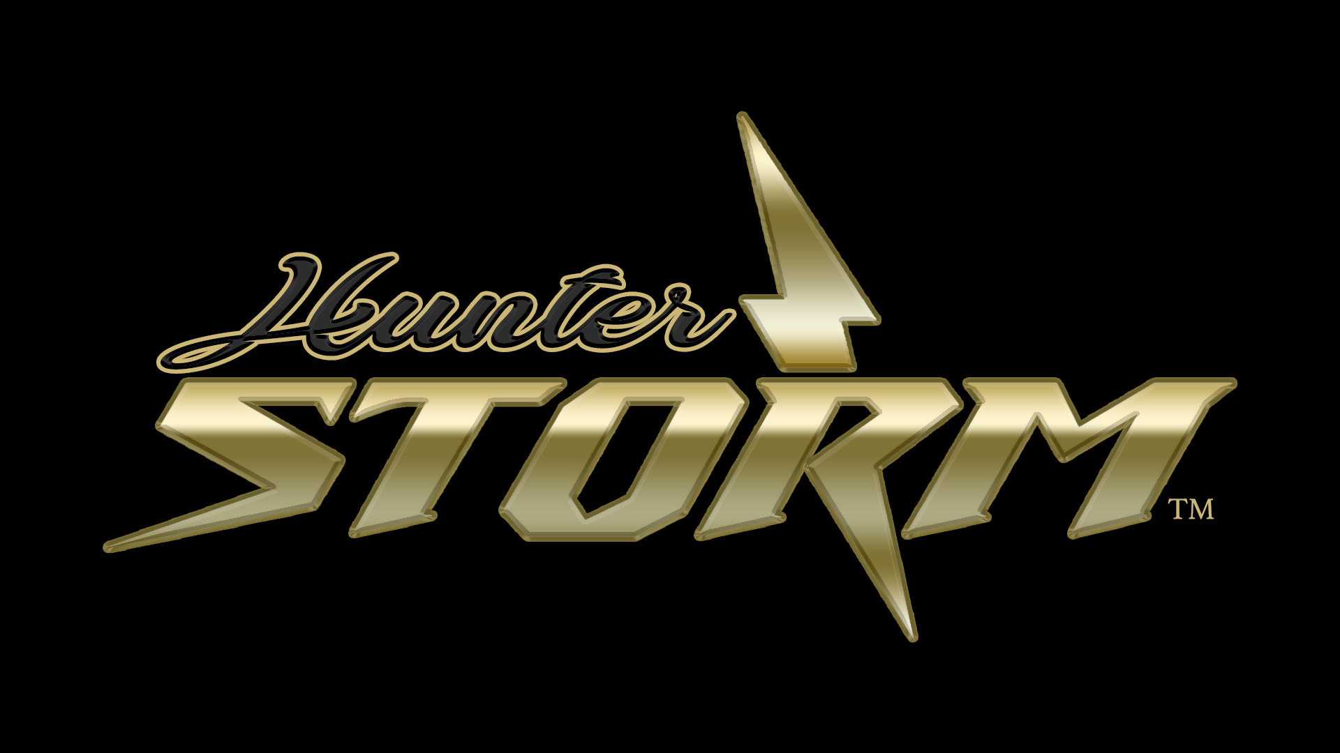 The iconic Hunter Storm logo featuring bold metallic gold lettering on a sleek black background, with the distinctive trademark symbol.