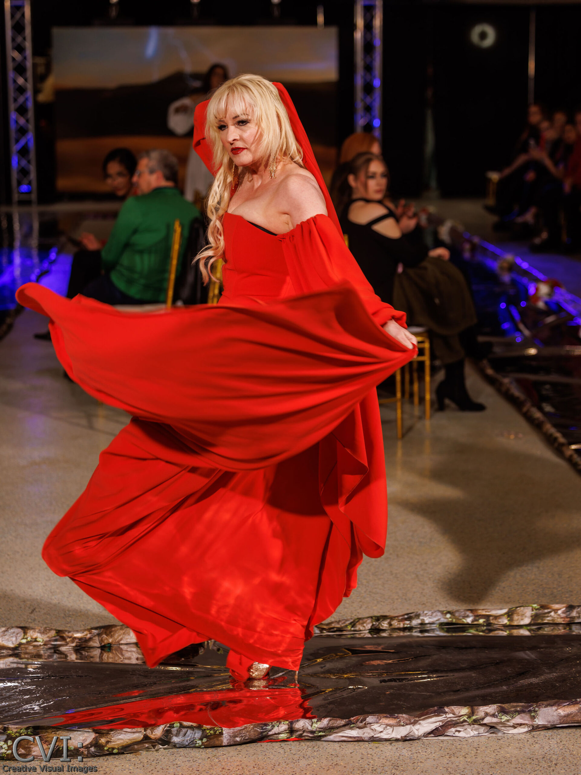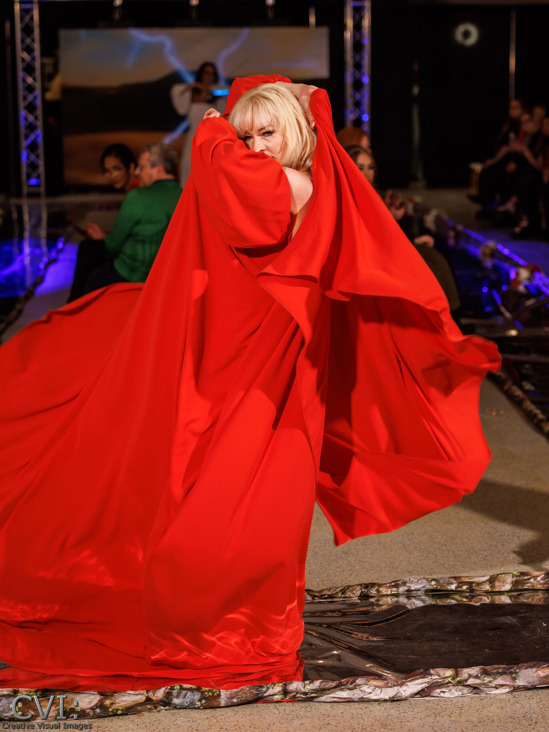 Hunter Storm stands defiant, a modern sorceress in the face of the tempest. In a Santorini dress with a 25-foot train billowing like a stormy sea, she channels the raw power of the elements. A stiletto-clad leg peeks from beneath the gown, grounding her against the wet road. The storm rages to the left, but she turns towards the glimmer of sunlight, a symbol of strength and resilience. Hunter’s expression is a mix of determination and poignancy, reflecting a warrior who has weathered much but remains unyielding. Just one of the reasons she is also known as “The Metal Valkyrie.”