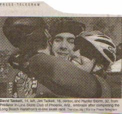 Hunter Storm, David Tackett, and Jim Tackett at Long Beach Marathon Half-Marathon Victory (black and white image from Long Beach Press Telegram newspaper)